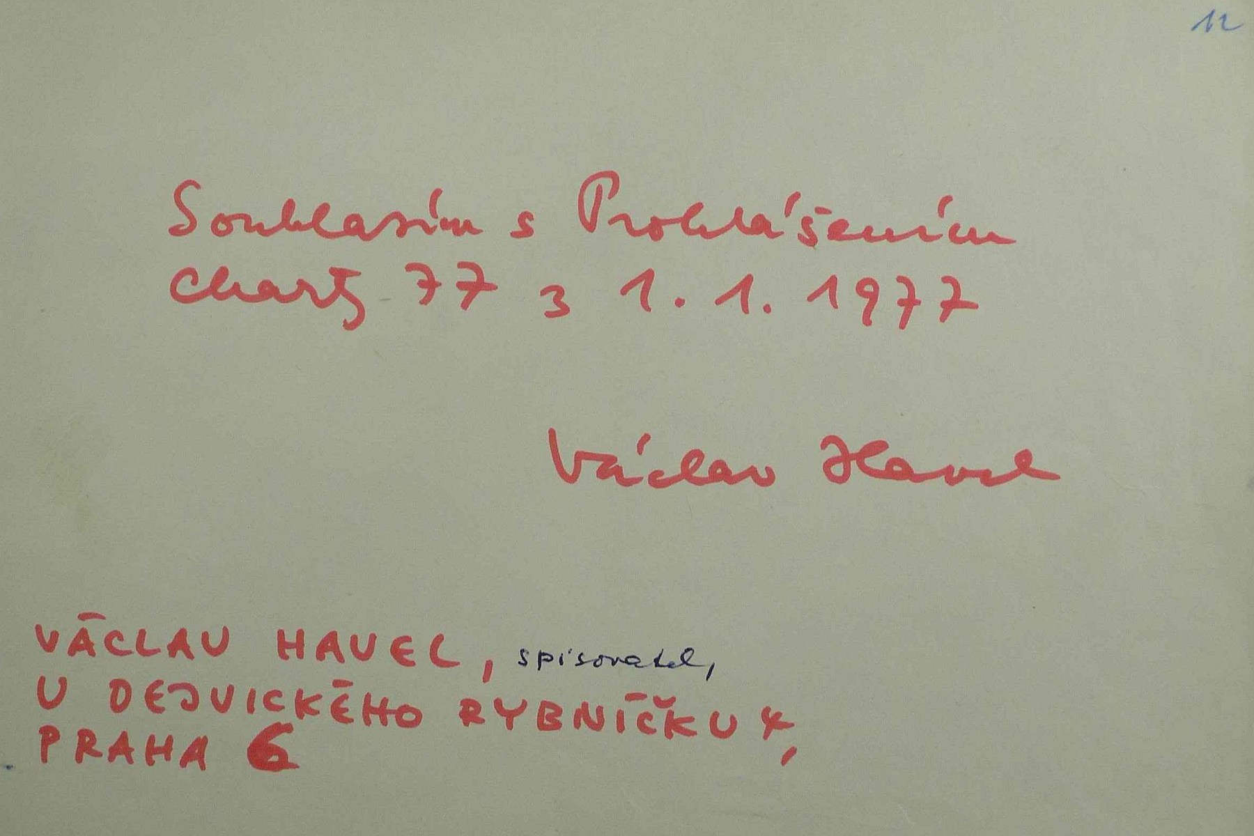 Prohlášení Charty 77 je založeno na srovnání mezinárodních paktů, přijatých čs. ústavními orgány jako mezinárodní závazek a současně jako platná norma čs. právního řádu, se skutečnými poměry, panujícími v Československu v oblasti lidských práv. Za dvanáct let došlo k určitému zlepšení, např. při přijímání ke studiu, v některých případech užívání práva na svobodu projevu, v kultuře a podobně. Základní rozpory mezi pakty a čs. skutečnosti však odstraněny nebyly a je proto zcela oprávněné se dnes veřejně přihlásit k zásadám Charty 77, deklarovaným v jejím základním prohlášení. Mluvčími Charty 77 již nejsou samozřejmě tři uvedení občané - Jan Patočka zemřel v březnu 1977 a od září téhož roku se mluvčí Charty 77 obvykle po roce střídají: funkci mluvčího předává stávající mluvčí po dohodě s dalšími jinému signatáři Charty 77.